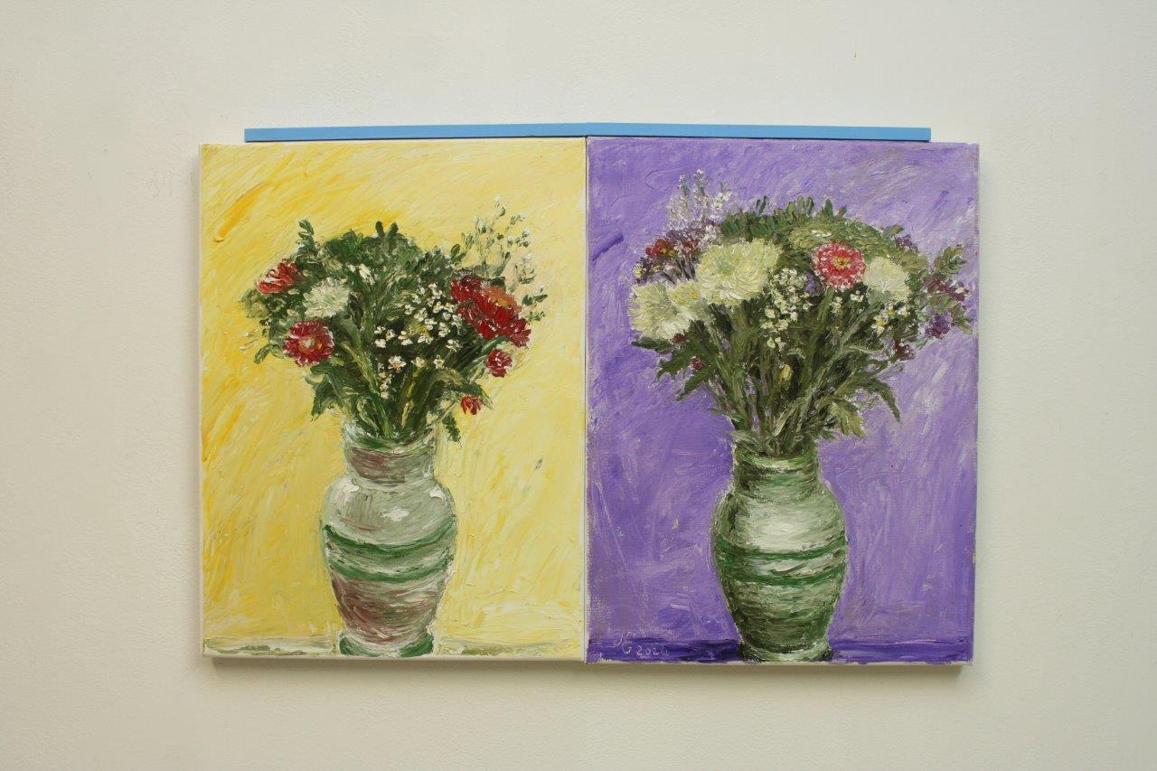 Ich präsentiere euch DUETTE, meinen aktuellen Bilderzyklus, an dem ich seit Anfang 2023 arbeite. Ich verwende dafür Kompositionen aus zwei kleinformatigen Werken verschiedener Bilderzyklen, die ich seit 1984 gemalt habe. Durch die Komposition entsteht ein Dialog.